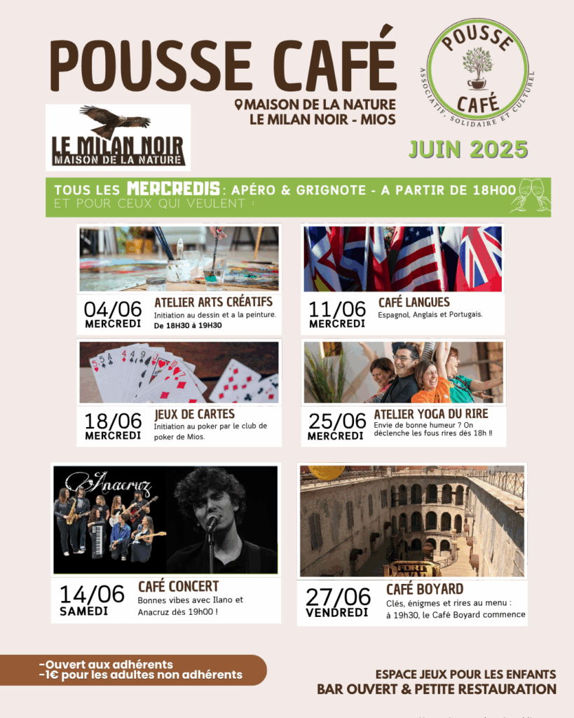 En juin, en plus de nos 2 soirées évènements du 14 et du 27, le pousse café ouvre tous les mercredis au Milan Noir à partir de 18 h pour l’apéro ! Viens profiter de son ambiance conviviale, taper une « petite discute » , faire un petit jeu … ou juste boire un verre entre amis. Boissons et grignotes à petits prix, comme d’habitude !