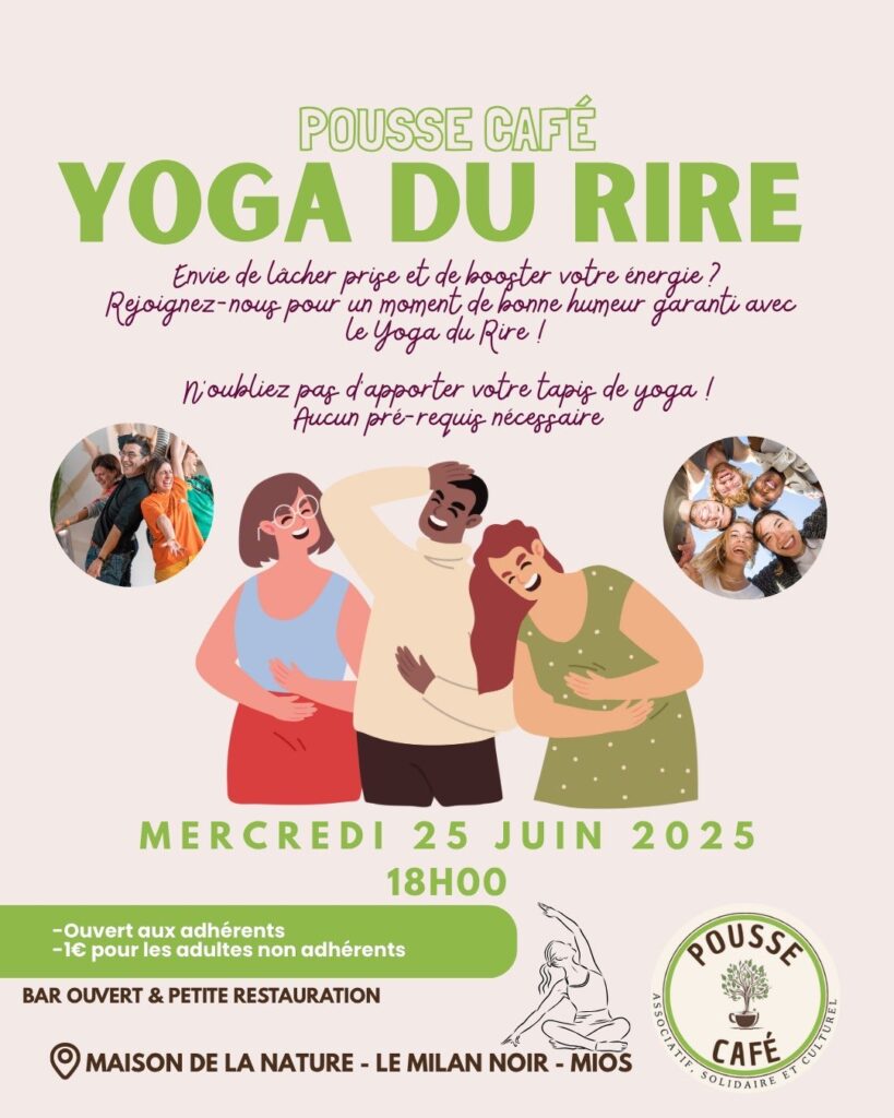 Envie de relâcher la pression et de recharger les batteries dans la bonne humeur ? Rejoins nous pour une séance de Yoga du Rire avec Pousse Café mercredi 25 juin au Milan Noir ( maison de la nature de MIOS) !