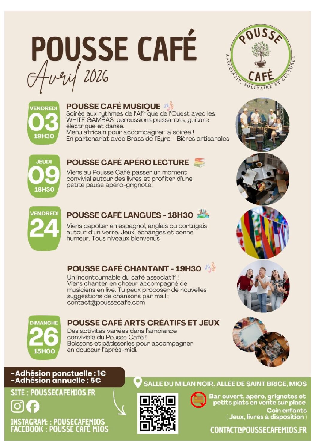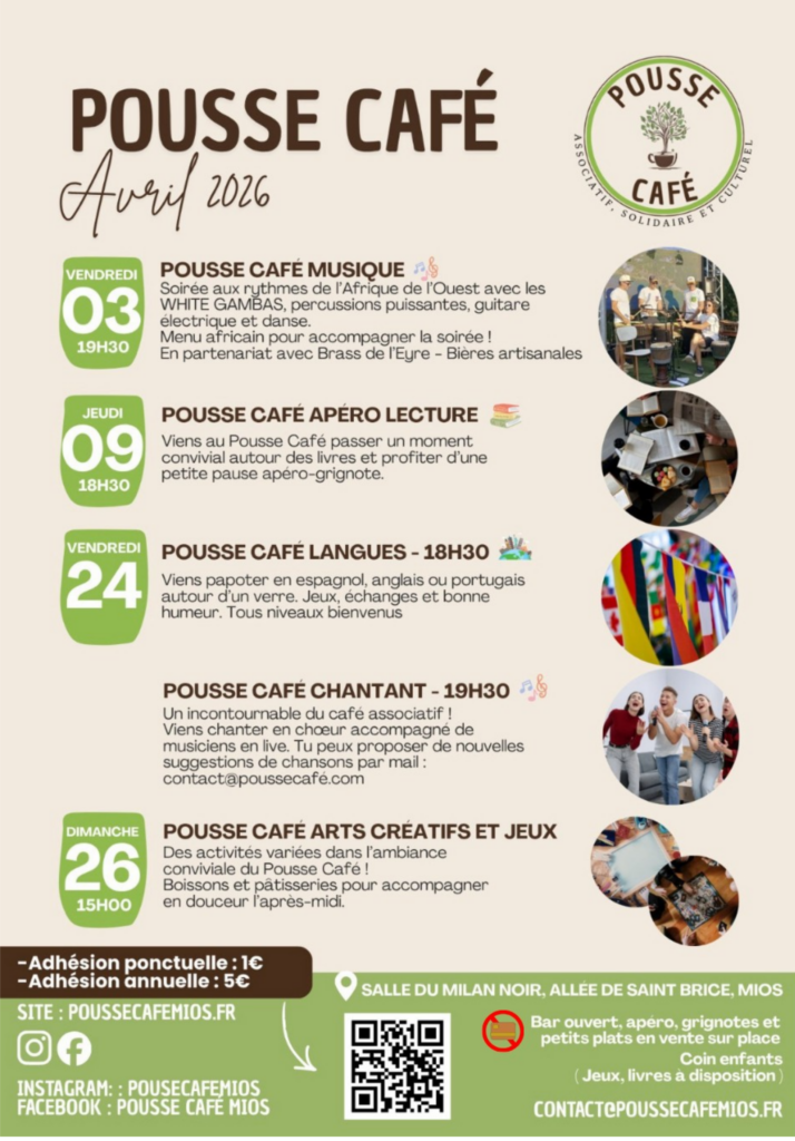 A noter hors programme , l’apéro des bénévoles dimanche 26 avril à 18h30 ! Offert par le café associatif à tous ceux qui ont donné un coup de main au bar, à la restauration, qui ont proposé une animation … mais aussi à tous ceux qui ont envie de participer à l’aventure du café associatif d’ici la fin de la saison.